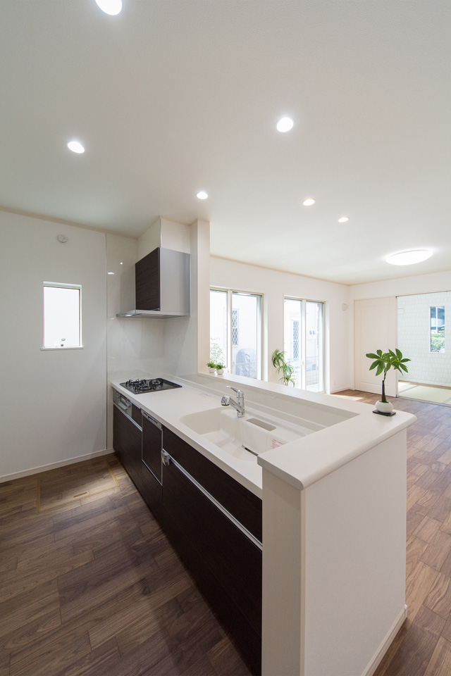 白を基調とした清潔感あるキッチン。ダークブラウンのキッチン扉がエレガントな雰囲気を演出。
