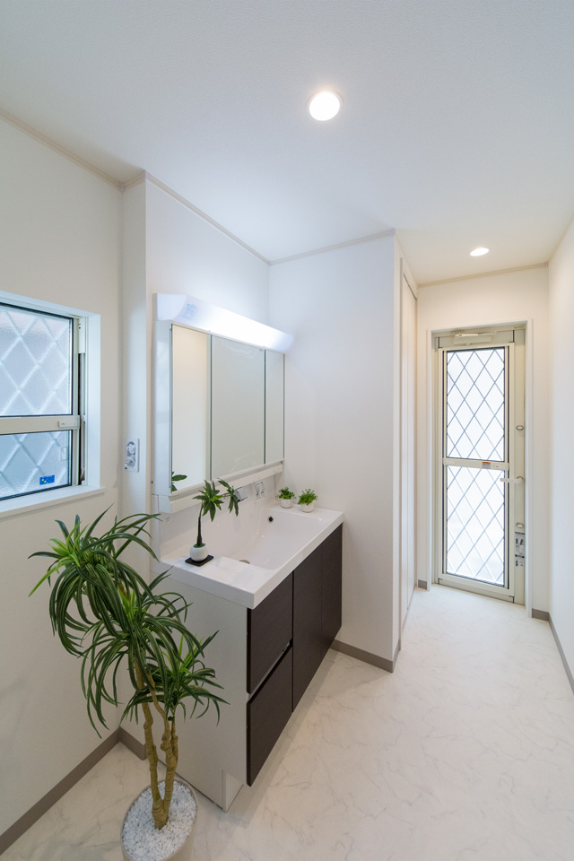 ダークブラウンの洗面化粧台がナチュラルな雰囲気の空間を演出するサニタリールーム。