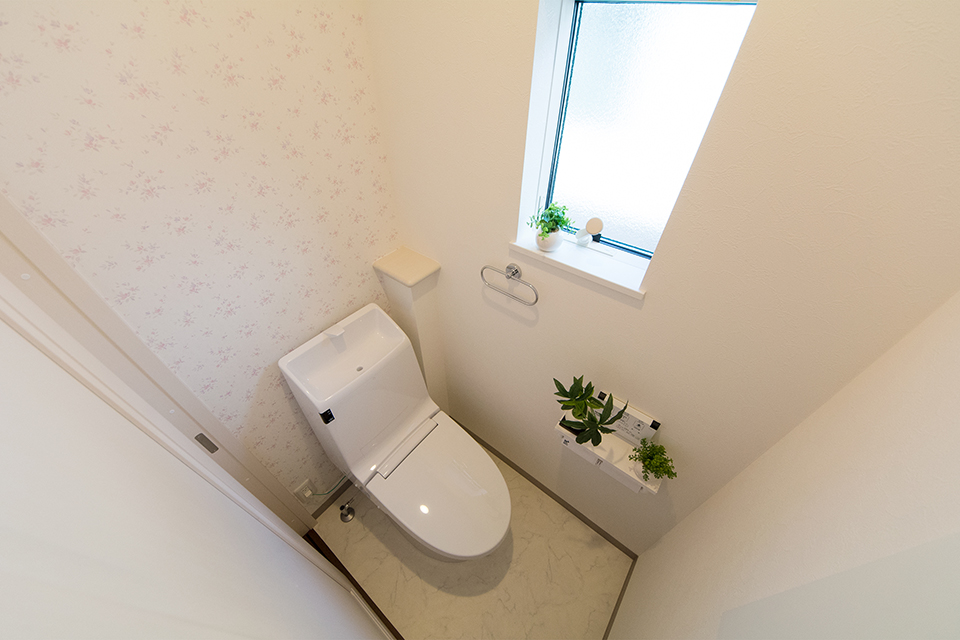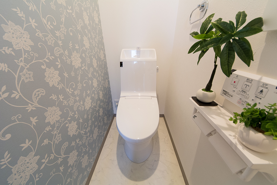 白を基調とした清潔感のある1階トイレ。ブルーのアクセントクロスが爽やかな印象をプラス。