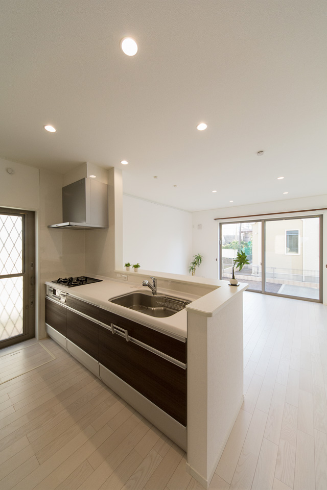 白を基調とした清潔感のあるキッチンスペース。オーク色のキッチン扉がナチュラルな雰囲気を演出。
