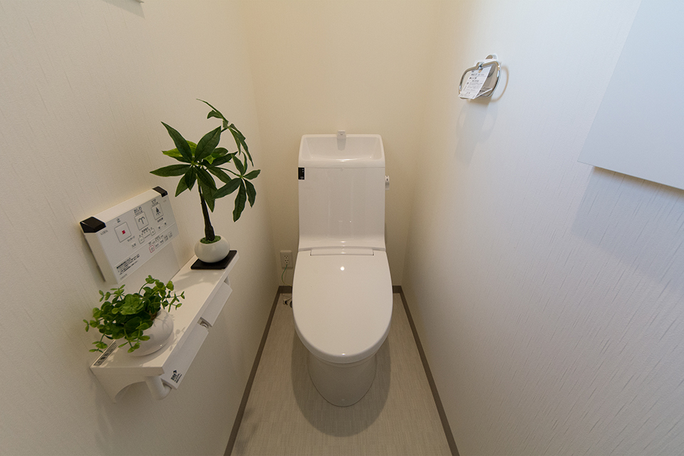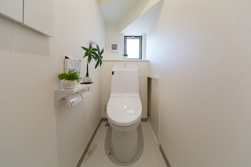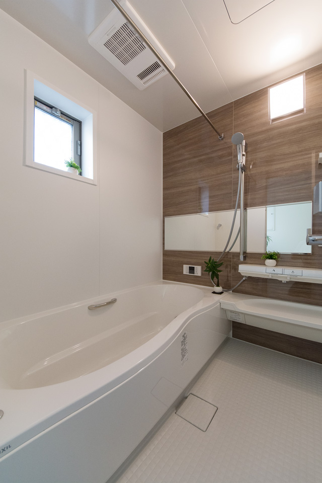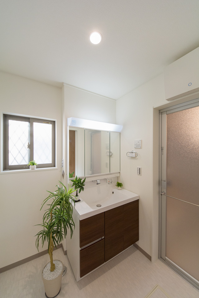 白を基調とした清潔感のあるサニタリールーム。ブラウンの洗面化粧台が印象的。