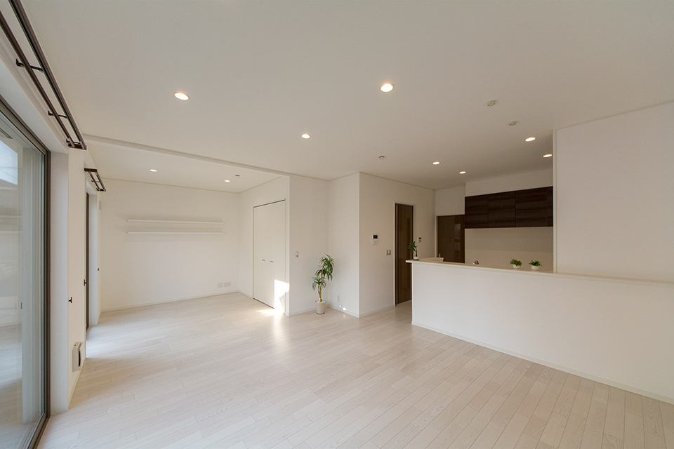 美しく繊細な木目のフローリング(ホワイトアッシュ)が窓から差し込む光を反射し、空間を優しく包み込みます。