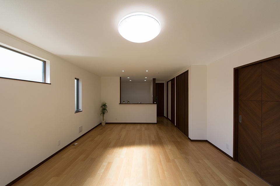 穏やかな木目と緻密な木肌が印象的なバーチのフローリングがウォルナット調の建具と相まって、ナチュラルな空間を演出。