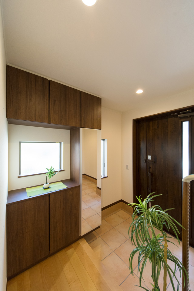 ベビーカーや傘立てなどが収納できる便利な土間収納を設えた玄関。