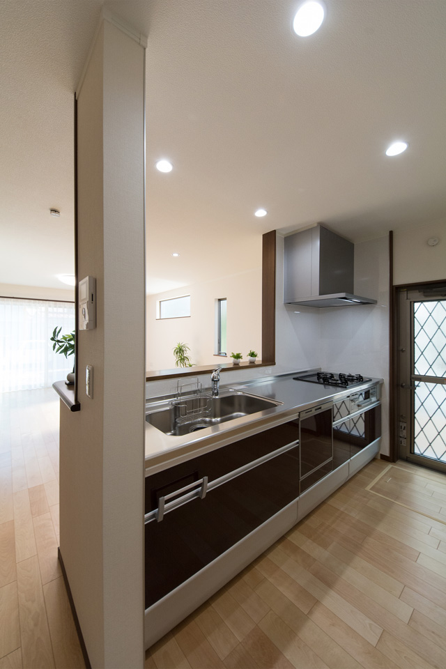 白を基調とした清潔感あるキッチン。ダークブラウンのキッチン扉がエレガントな雰囲気を演出。