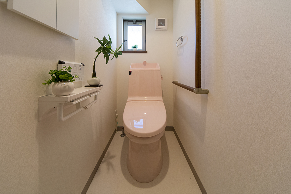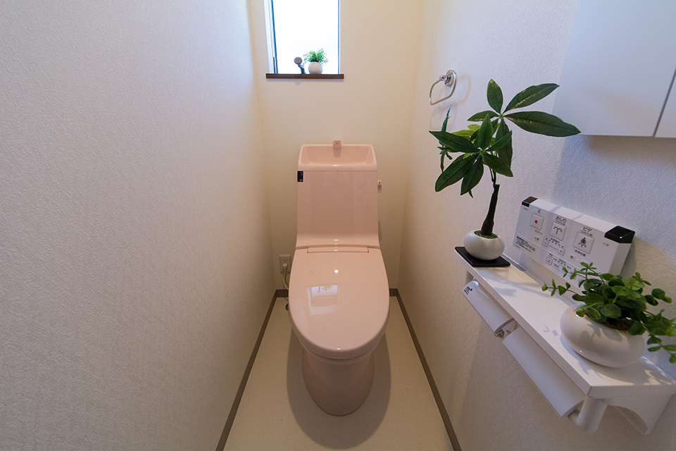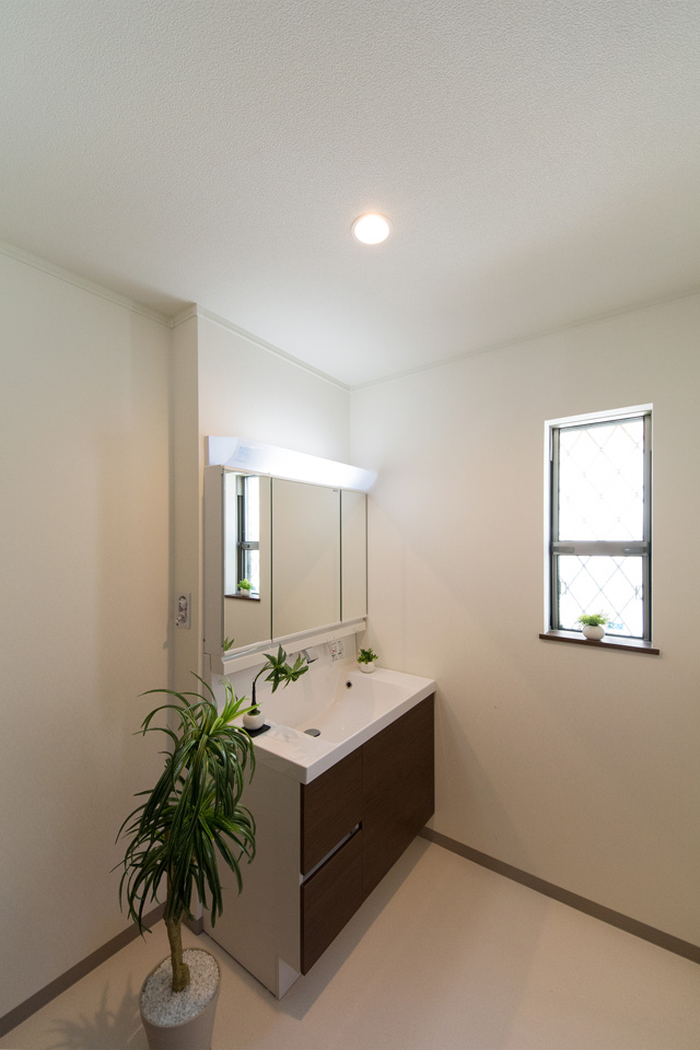 白を基調とした清潔感のあるサニタリールーム。ブラウンの洗面化粧台がナチュラルな印象を与えます。