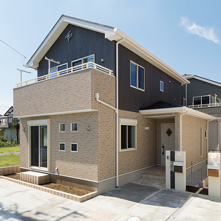 ブラウンのブリック調サイディングをベースに、ビターブラウンの木目調サイディングでアクセント。 温かみのあるナチュラルなデザインに仕上がりました。