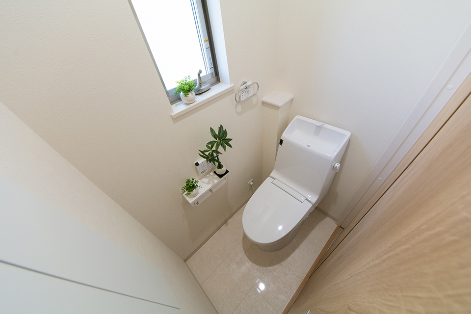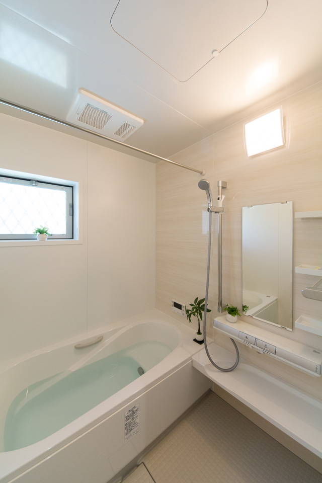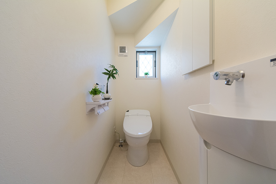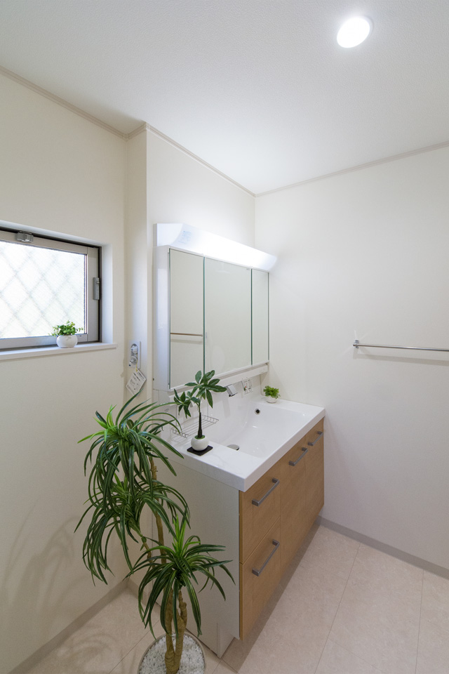 白を基調とした清潔感のあるサニタリールーム。ブラウンの洗面化粧台がナチュラルな印象を与えます。
