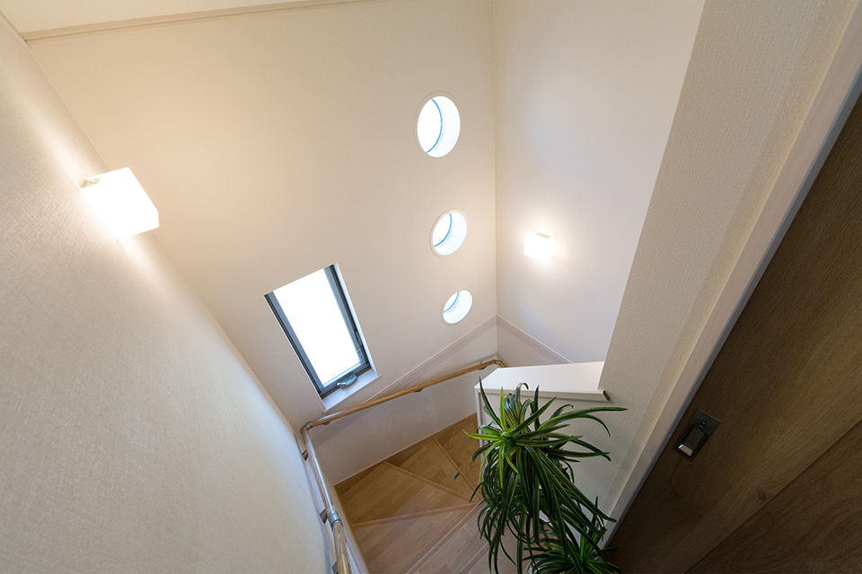 丸型のFIX窓が印象的な明るく開放感のある階段スペース。
