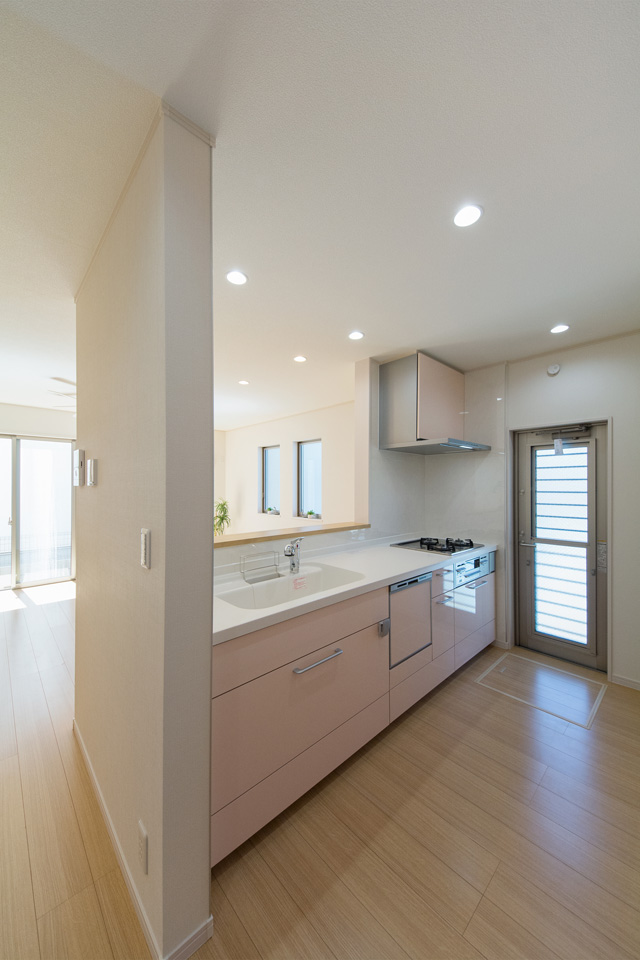 白を基調とした清潔感のあるキッチンスペース。ミストピンクのキッチン扉が爽やかな印象をプラス。