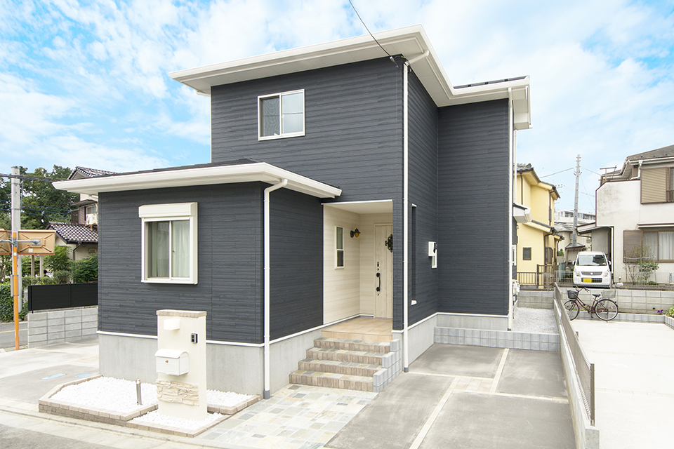 黒の木目調サイディングをメインに、一部白の木目調サイディングでアクセント。 ナチュラル&モダンなデザインに仕上がりました。