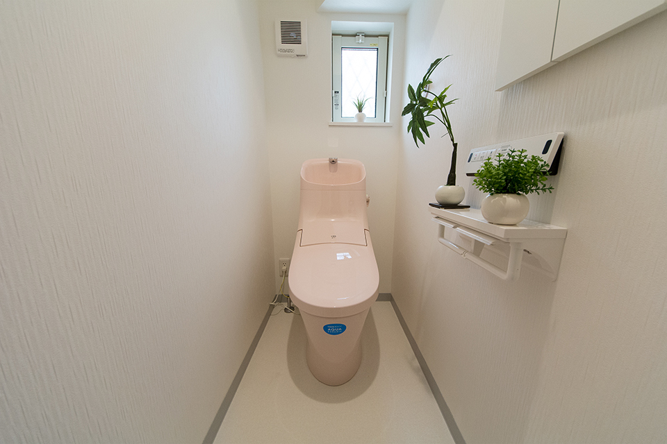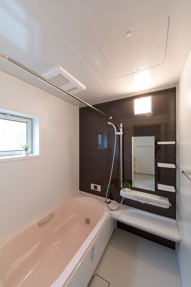 白を基調とした清潔感のあるサニタリールーム。パステルピンクの洗面化粧台が可愛らしい印象を与えます。