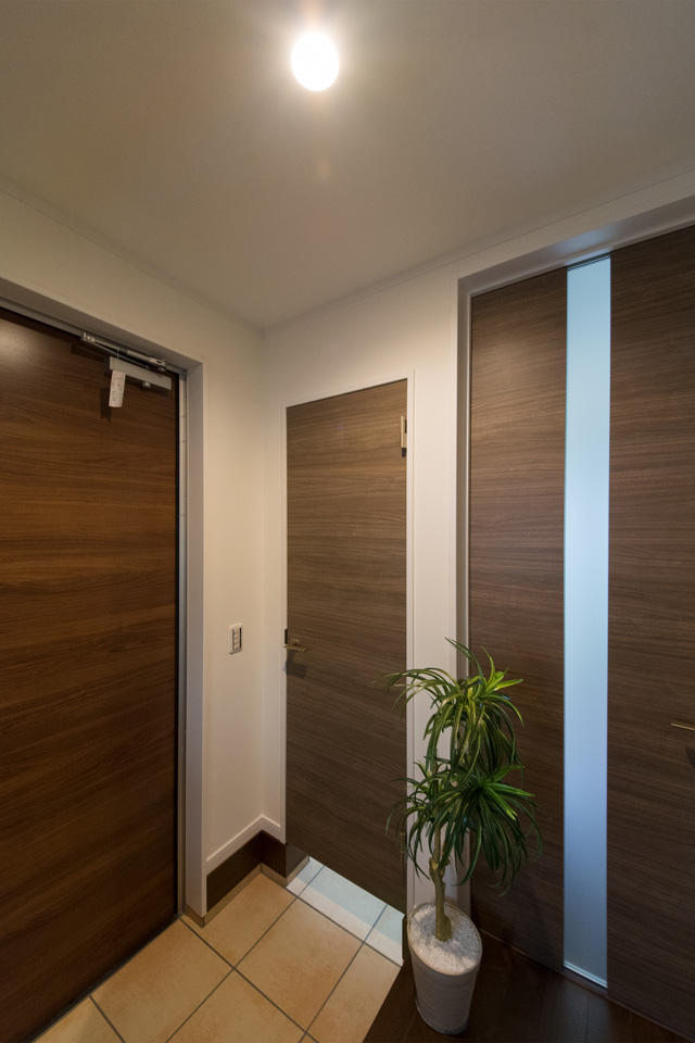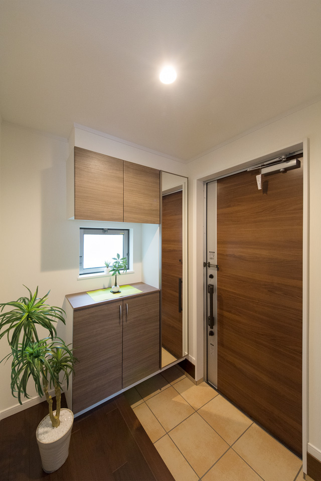 モカ色の重厚感がある玄関ドアが印象的な玄関。
