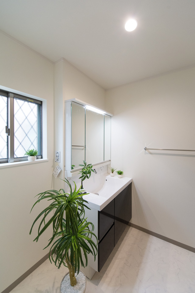 ブラウンの洗面化粧台がナチュラルな雰囲気の空間を演出するサニタリールーム。