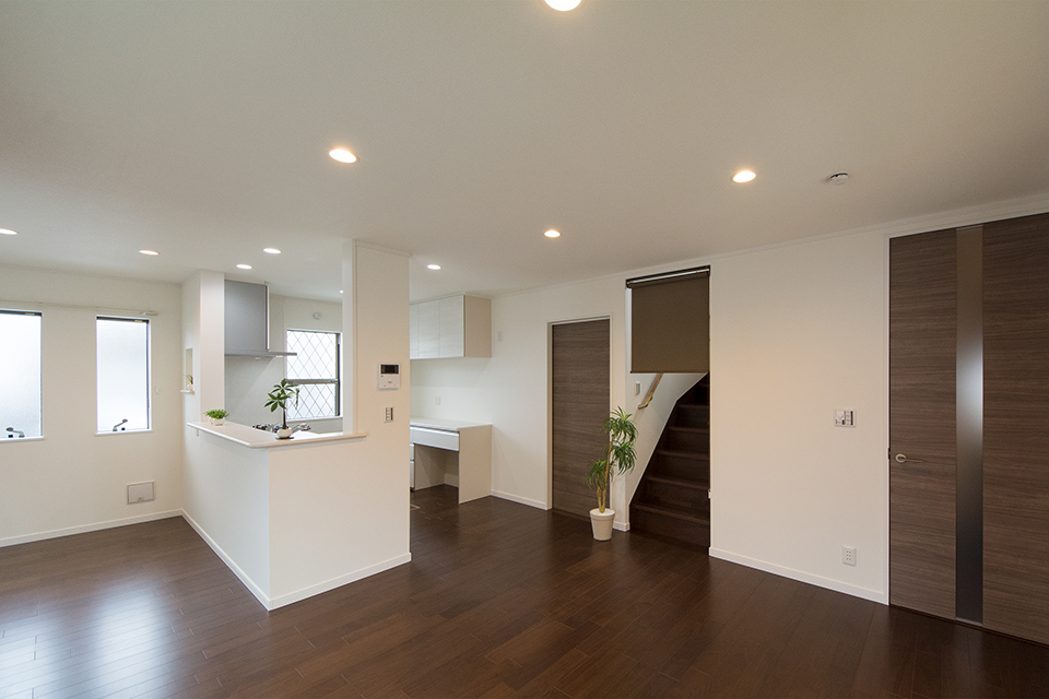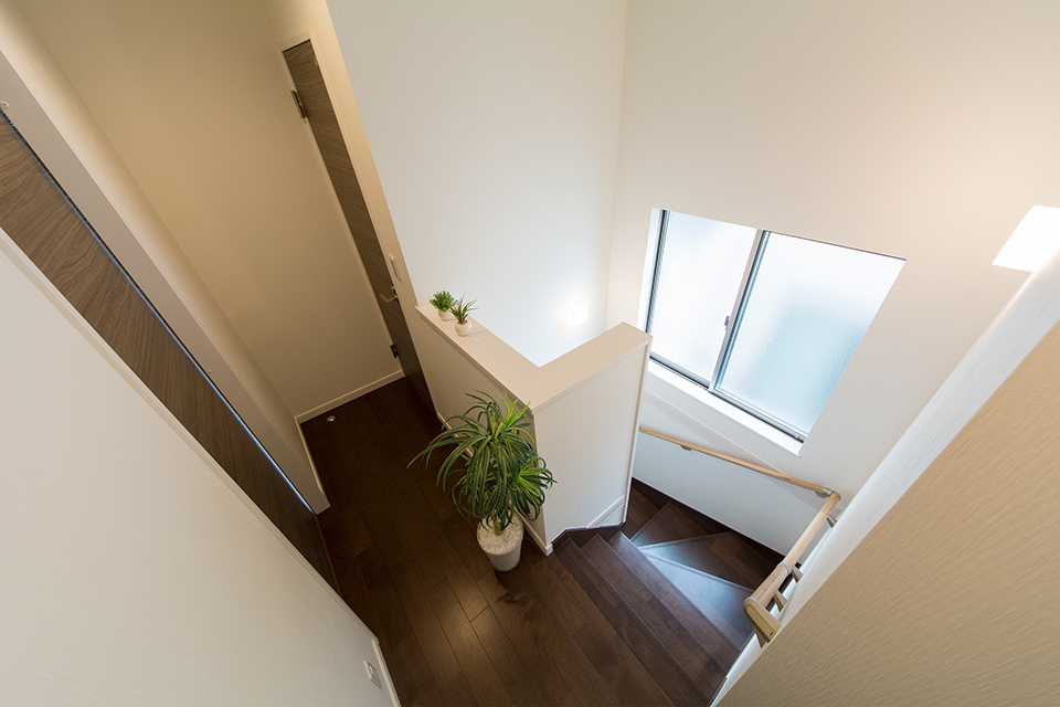 家族の笑顔とコミュニケーションを育むリビング階段を採用。ロールスクリーンで間仕切ることで、断熱効果もアップします。