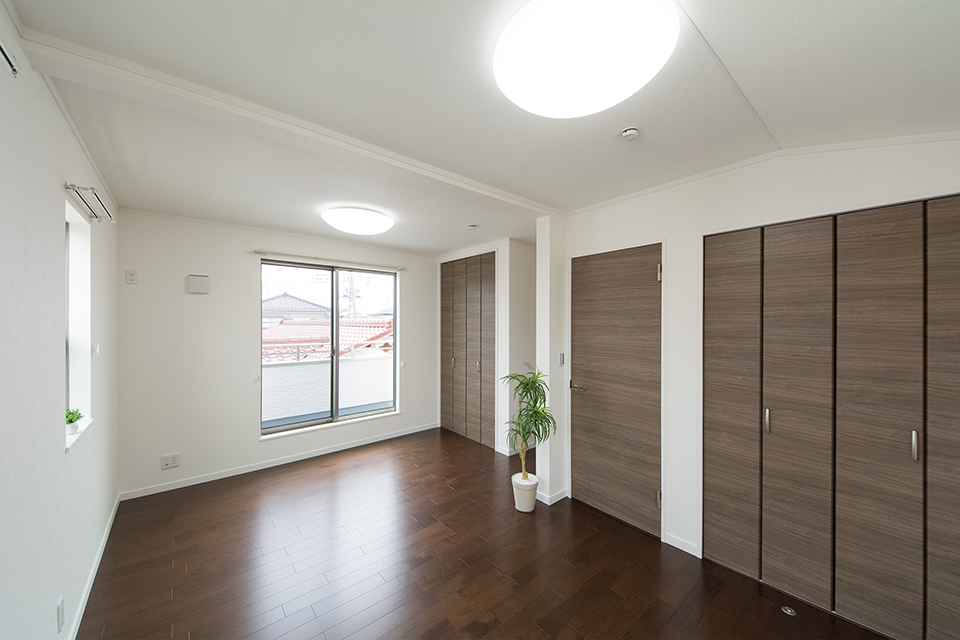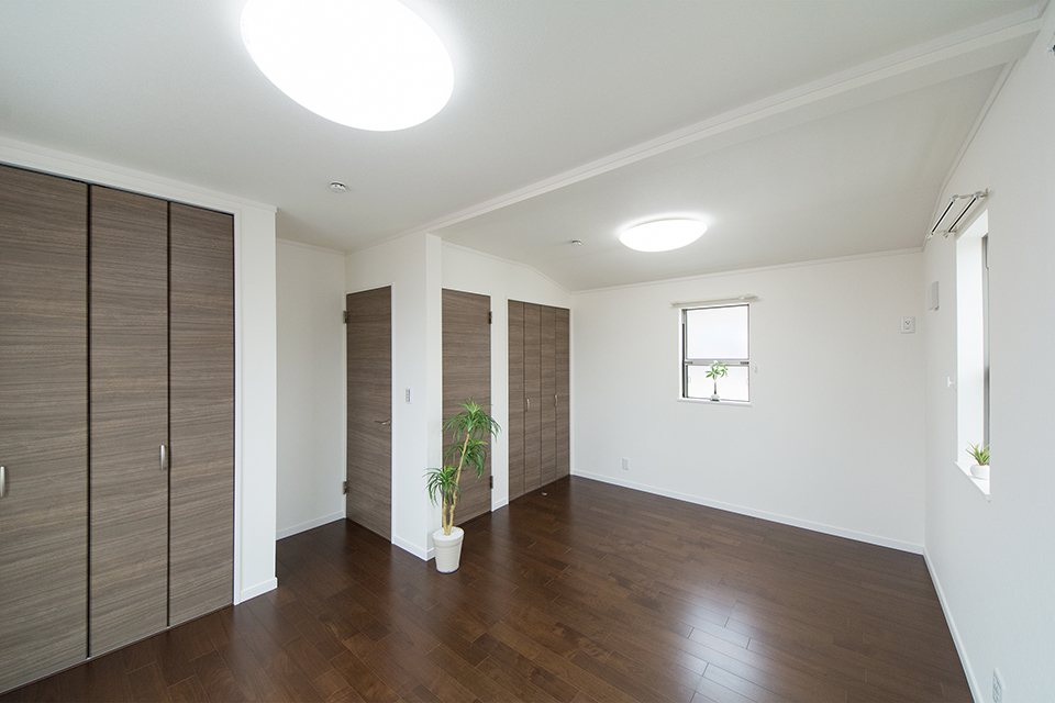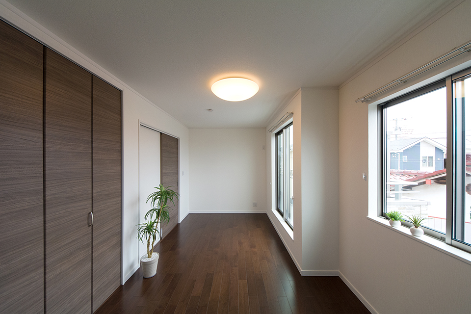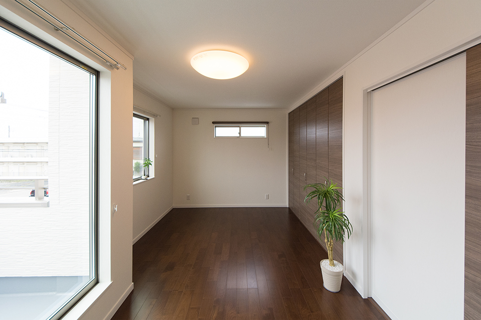 2階洋室-ブラックウォルナットのフローリングと白いクロスがメリハリのある空間を演出。