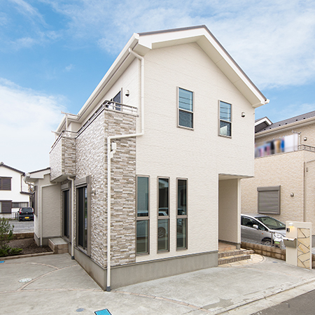白のサイディングをメインに、石積み調ブラウンのサイディングでアクセントをつけた、シンプル&モダンなデザイン。 縦長の3連窓が端正な表情でスタイリッシュに演出。