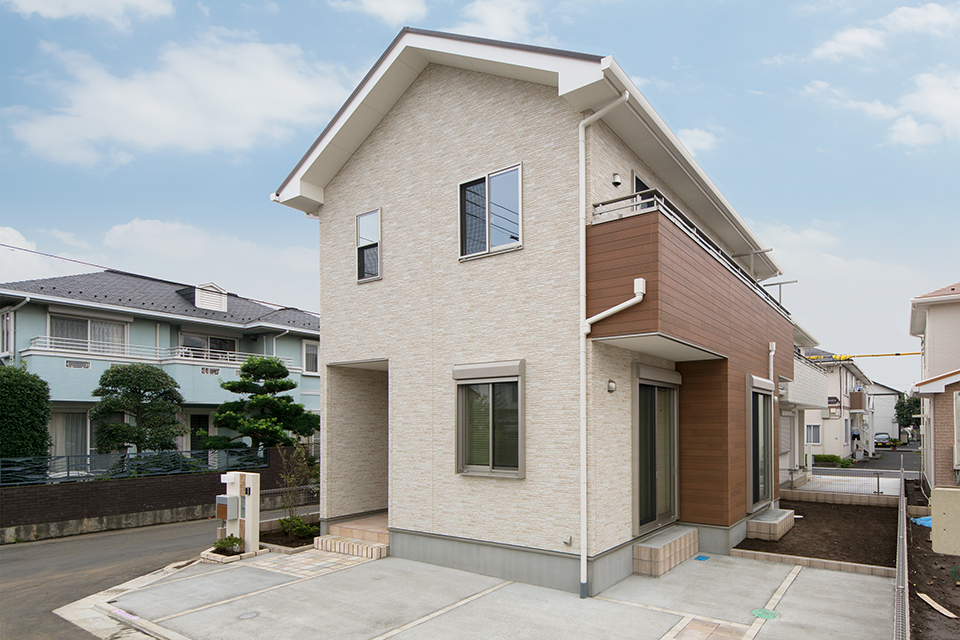 白のサイディングをメインに、石積み調ブラウンのサイディングでアクセントをつけた、シンプル&モダンなデザイン。 縦長の3連窓が端正な表情でスタイリッシュに演出。