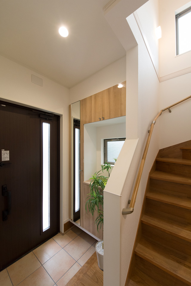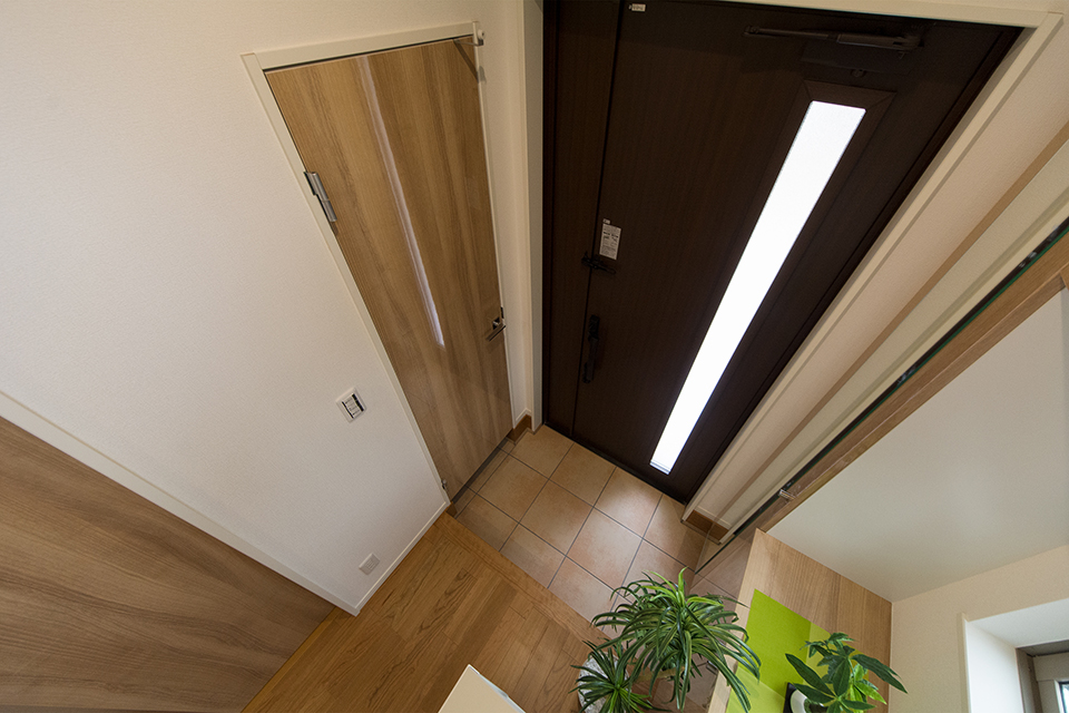 縦スリットから自然の光が差し込み明るく開放感のある玄関。