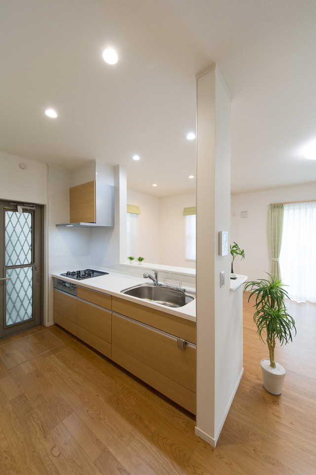 ブラウンのキッチン扉がナチュラルな空間を演出。