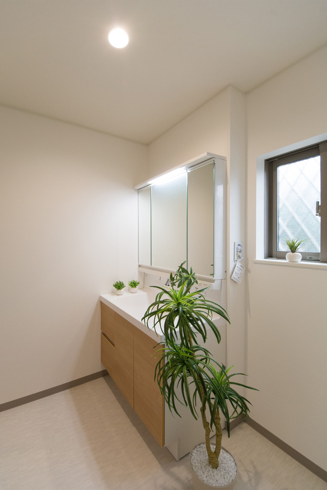 白を基調とした清潔感のあるサニタリールーム。ブラウンの洗面化粧台がナチュラルな印象を与えます。