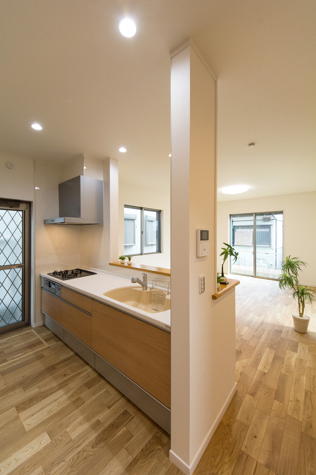 白を基調とした清潔感のあるキッチンスペース。ライトオークのキッチン扉がナチュラルな雰囲気を演出。