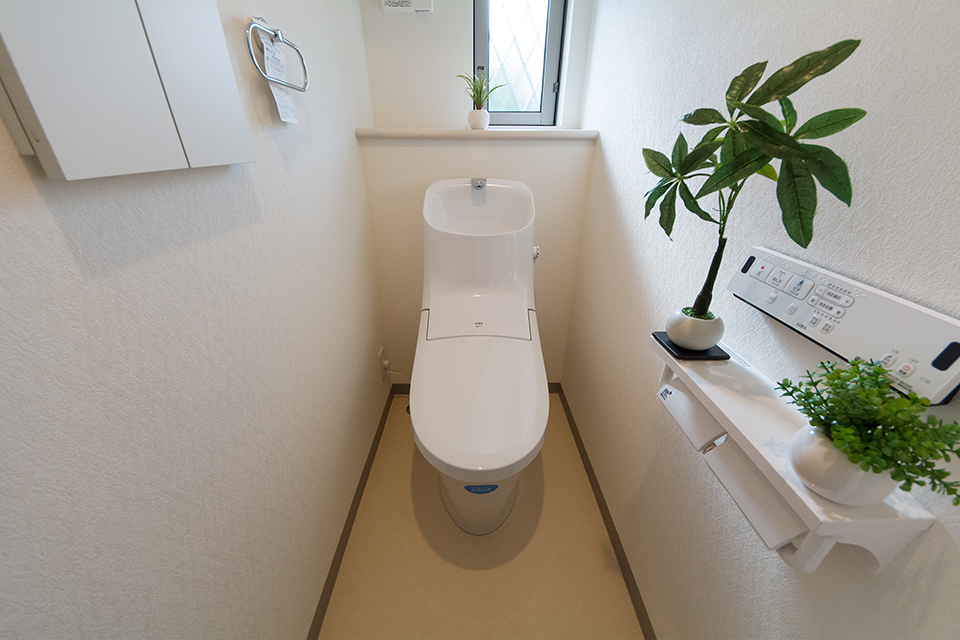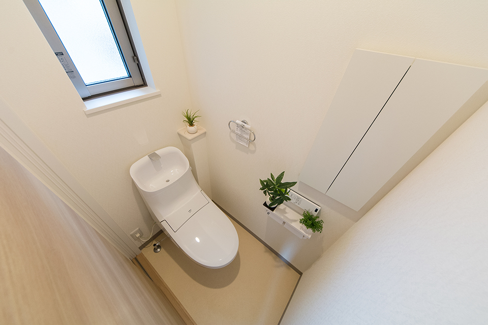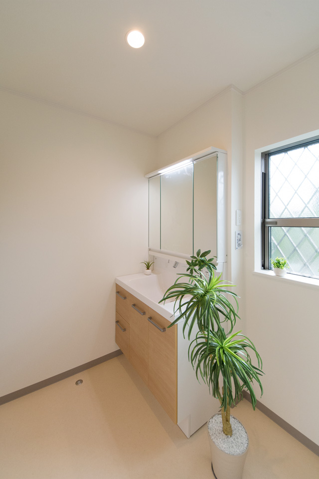 白を基調とした清潔感のあるサニタリールーム。ブラウンの洗面化粧台がナチュラルな印象を与えます。