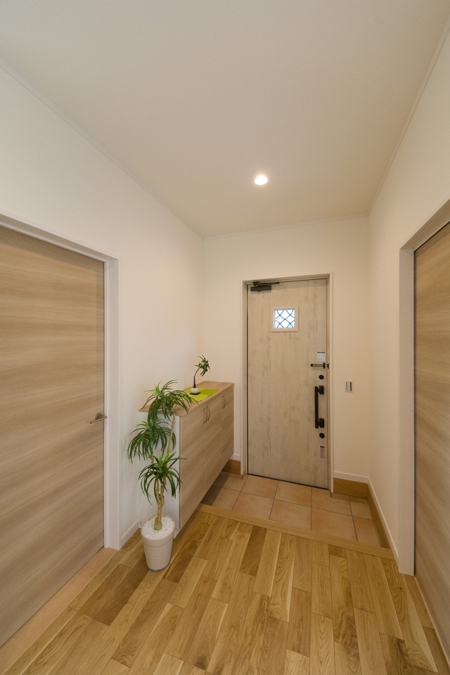 ナチュラルな雰囲気を演出するエクリュアイボリーの玄関ドア。小窓部分から差し込む光が、明るく開放的ある空間を演出。