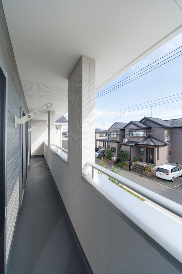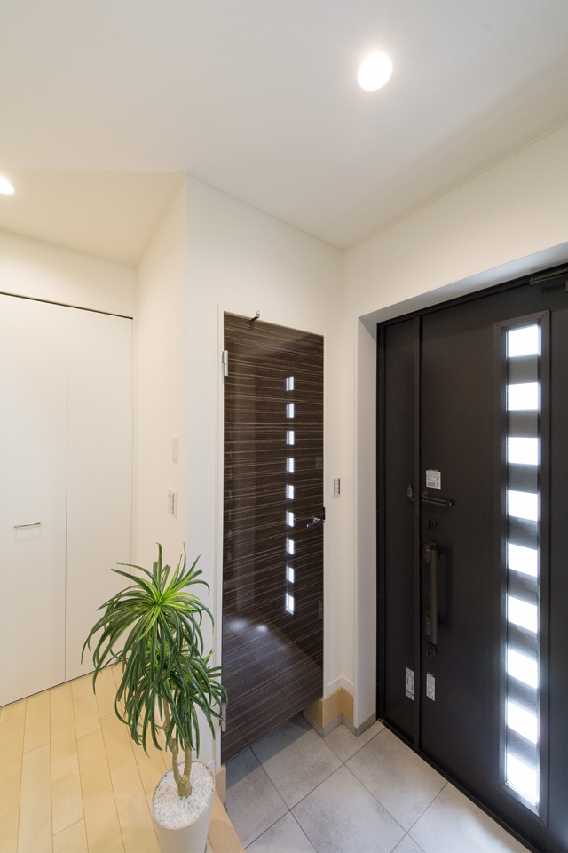 白のボーダー柄サイディングを基調に、無機質なコンクリートの質感にリアルな木目の風合いをプラスしたグレーのサイディングでアクセント。 シンプル&モダンなデザイン仕上がった、未来の暮らしを叶えるZEH対応住宅。