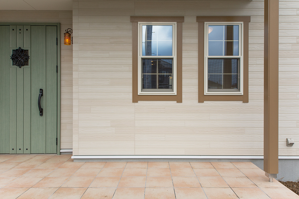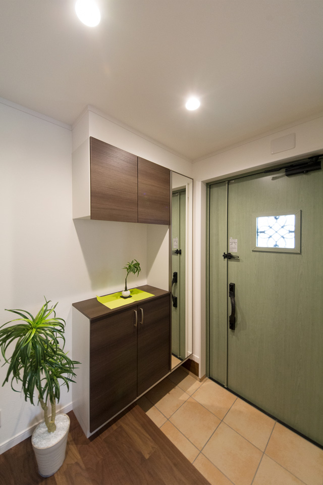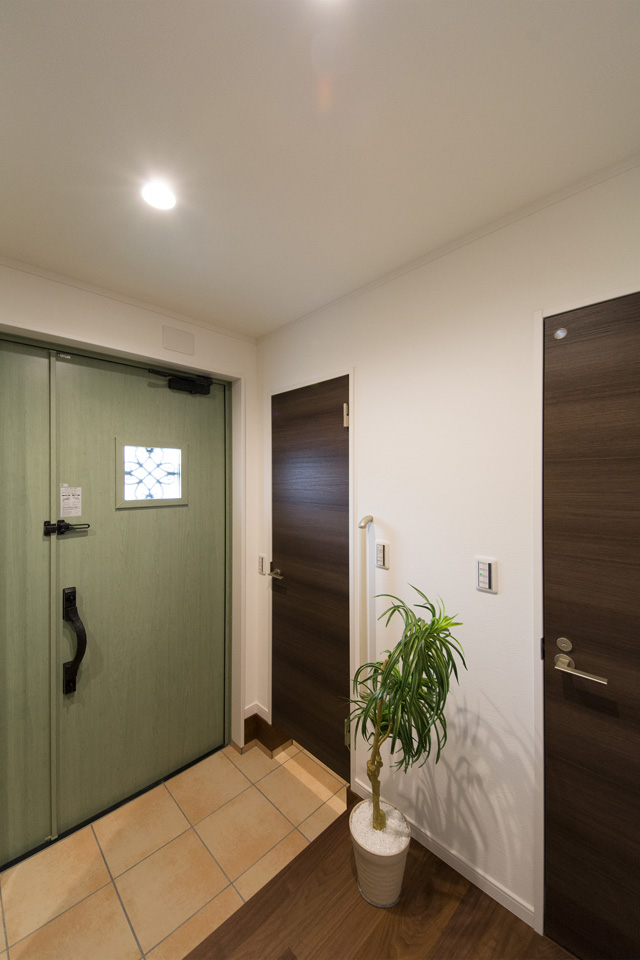 リーフグリーンの玄関ドアとベージュのテラコッタ調タイルがナチュラルな空間を演出。