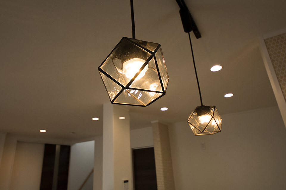 繊細なカッティングが美しいガラスシェードのペンダントライト。