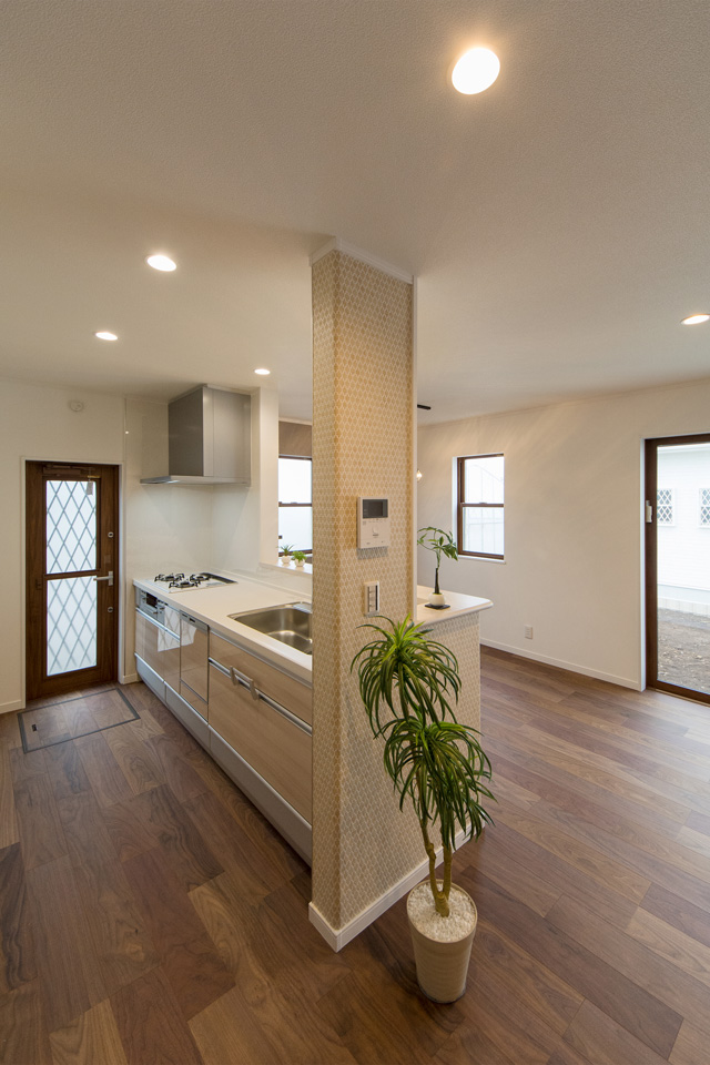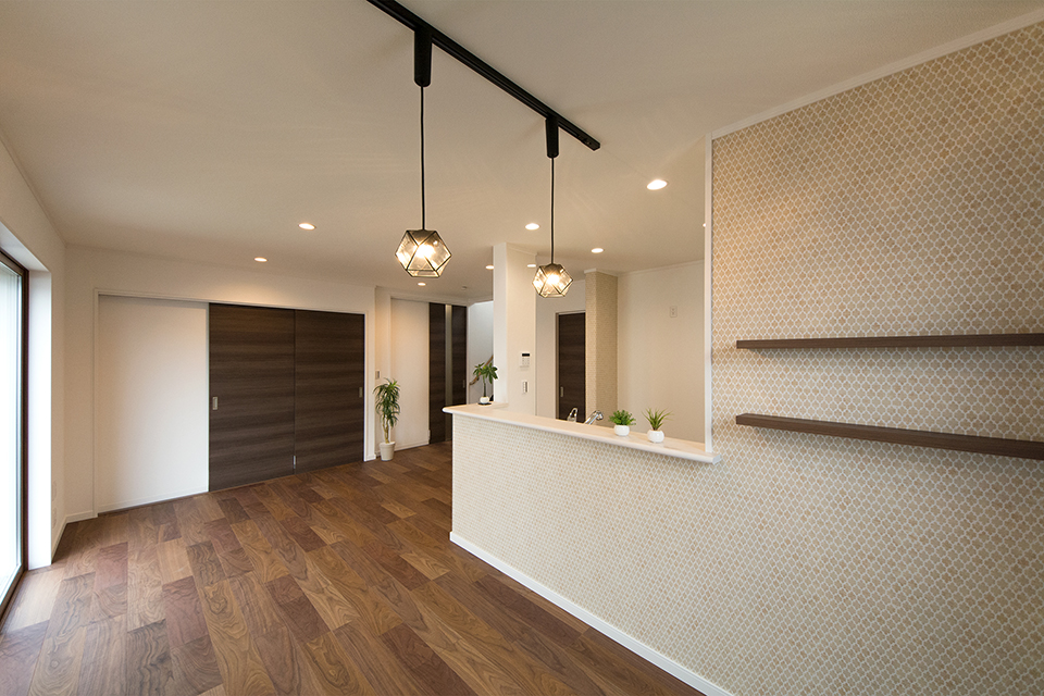 カウンターまわりにあしらったアクセントクロスが印象的なキッチンスペース。