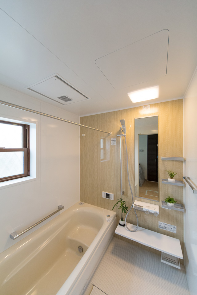 バスルーム。ナチュラルな配色のアクセントパネルを使用した、心地良い穏やかな空間。