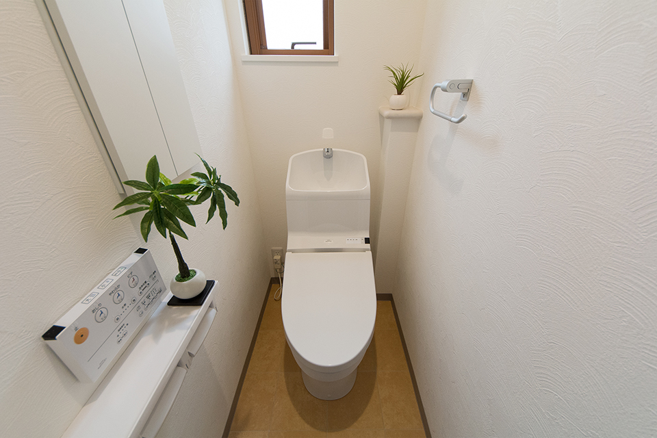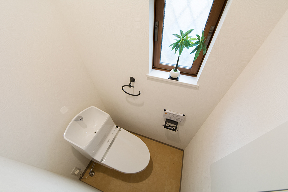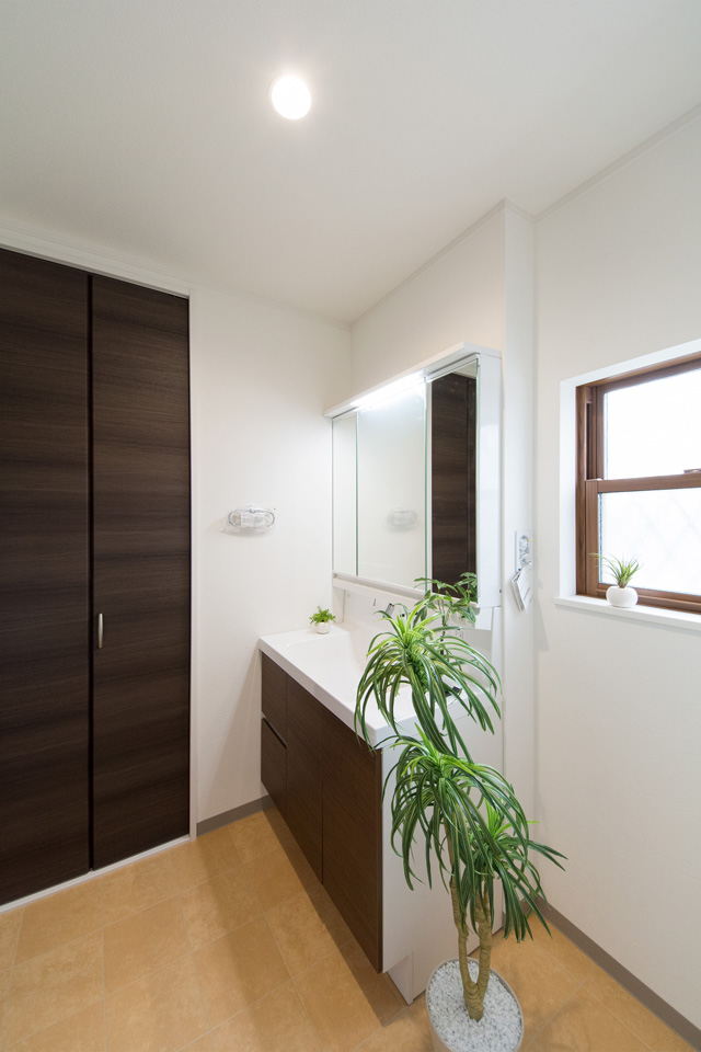 白を基調とした清潔感のあるサニタリールーム。ブラウンの洗面化粧台とテラコッタ調のフロアがナチュラルな雰囲気を演出。