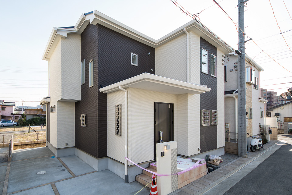 ダークブラウンをアクセントとした シンプルモダンな外観