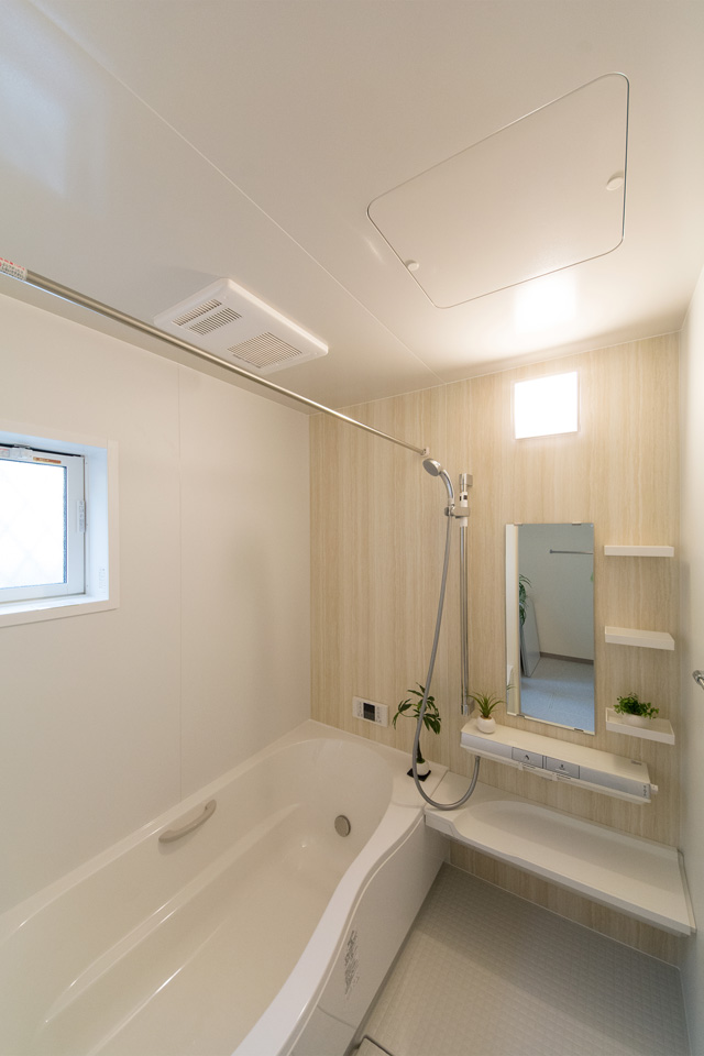 ブラウンの洗面化粧台がナチュラルな雰囲気の空間を演出するサニタリールーム。