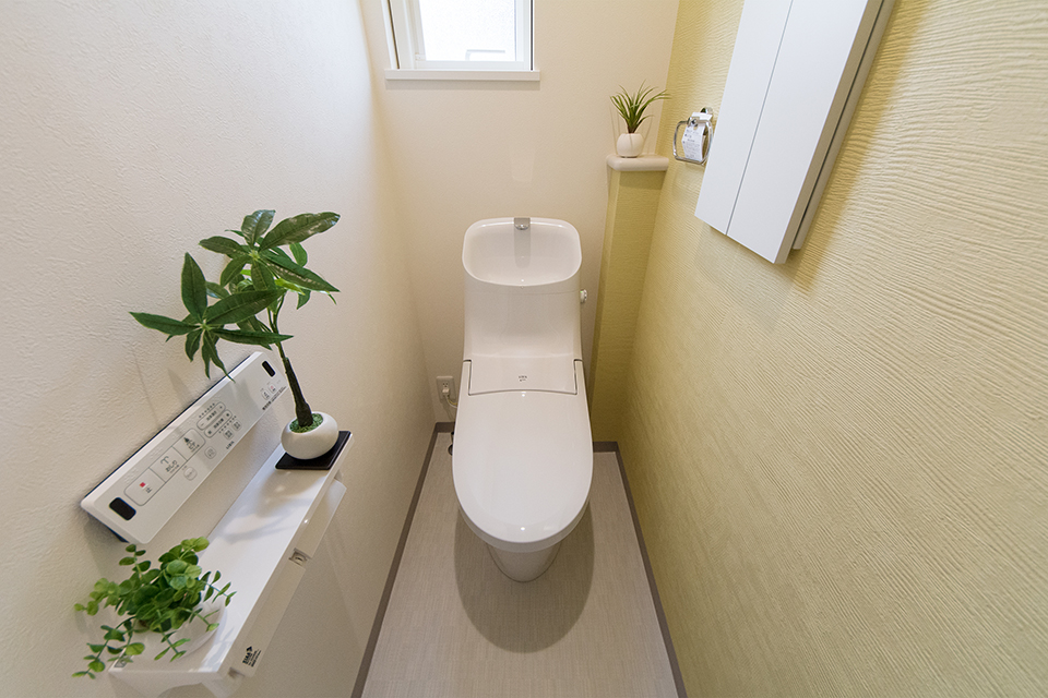 白を基調とした清潔感のある1階トイレ。アクセントクロスが爽やかな印象を与えます。