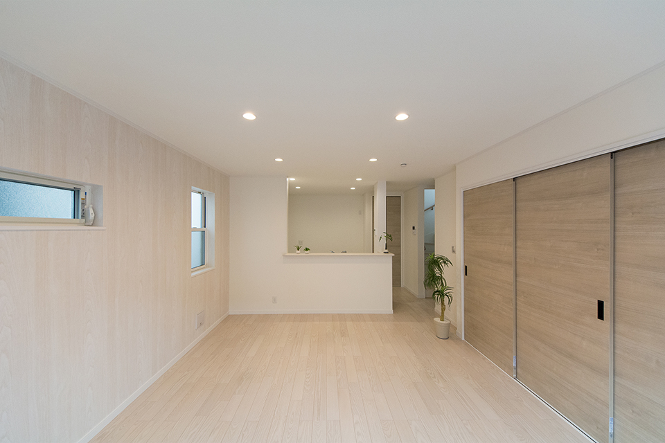 美しく繊細な木目のフローリング(ホワイトアッシュ)が窓から差し込む光を反射し、空間を優しく包み込みます。