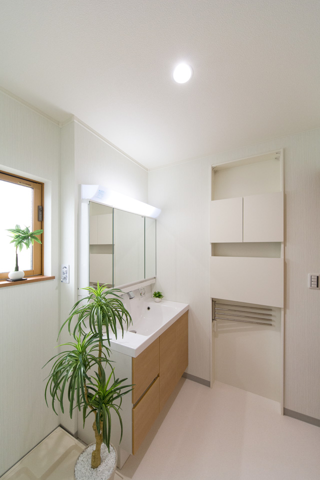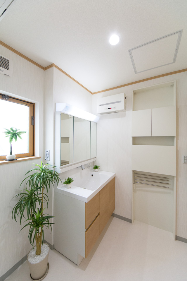 白を基調とした清潔感のある1階サニタリールーム。ブラウンの洗面化粧台がナチュラルな印象を与えます。