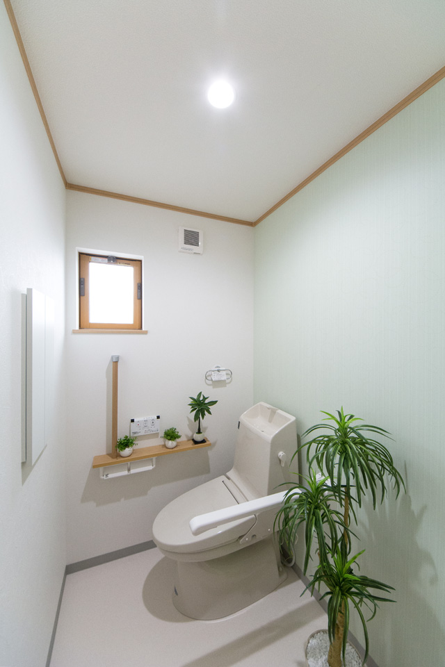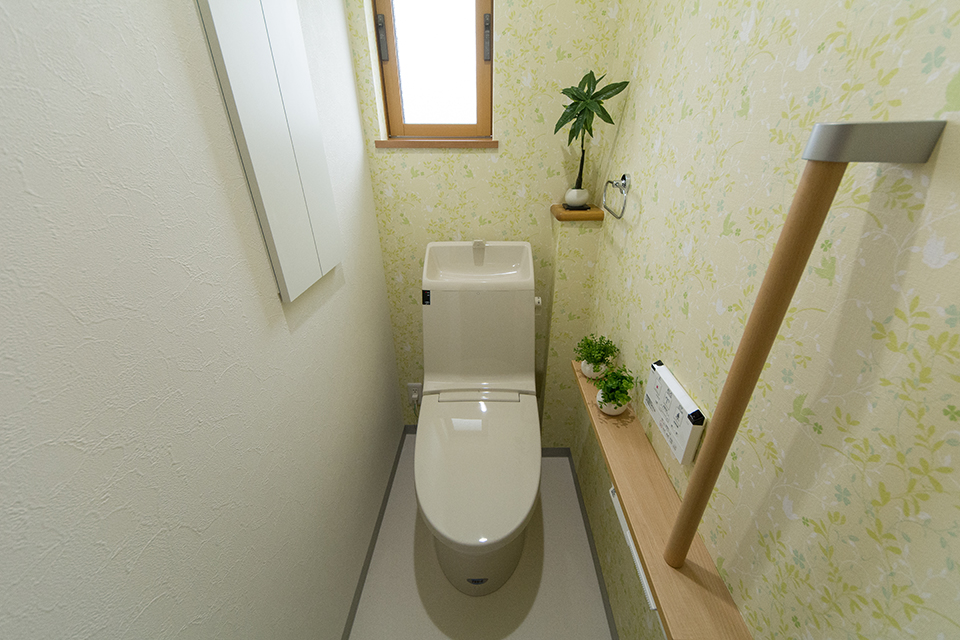 白を基調とした清潔感のある1階トイレ。アクセントクロスが爽やかな印象を与えます。