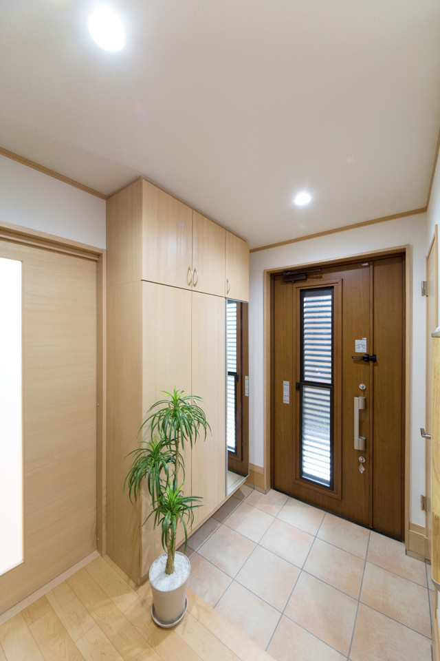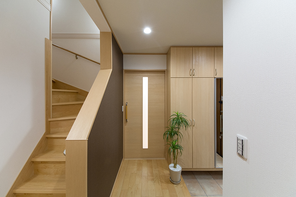 ベビーカーや傘立てなどが収納できる便利な土間収納を設えた玄関。