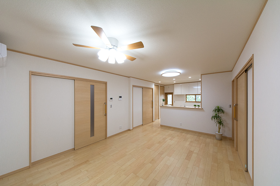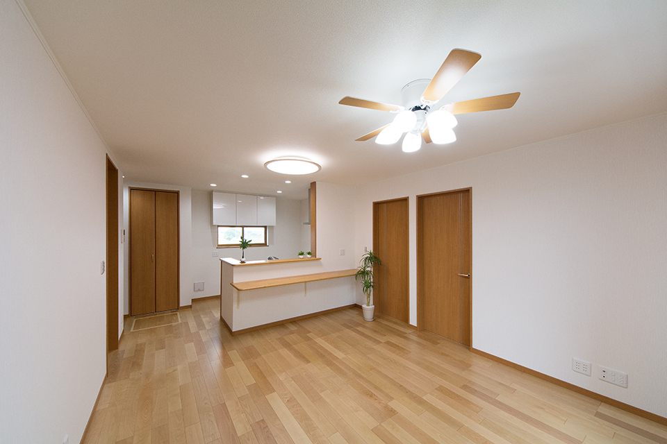 1階LDK―リビングにはインテリアファンを設置。空気の流れで快適な居住空間を可能に。