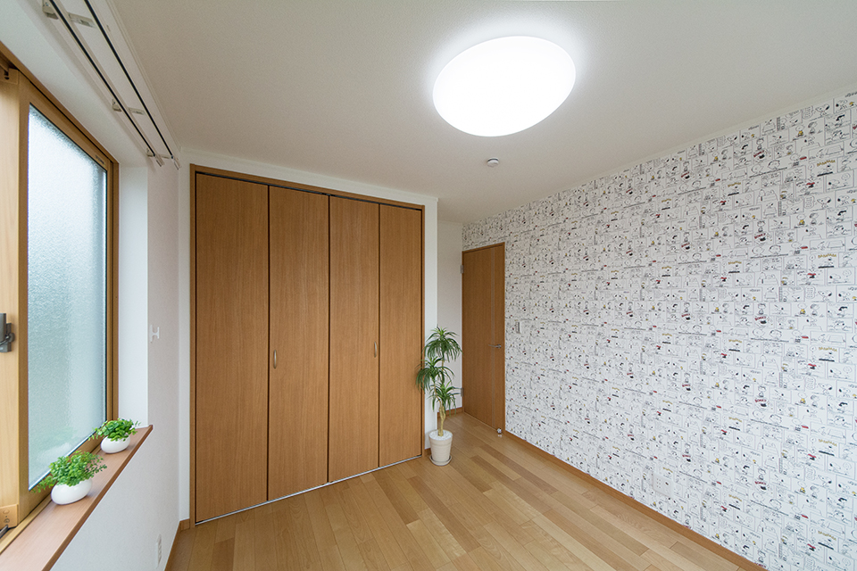 2階洋室―バーチのフローリングとブラウンの建具が、ナチュラルな空間を演出。アクセントクロスが空間を彩ります。