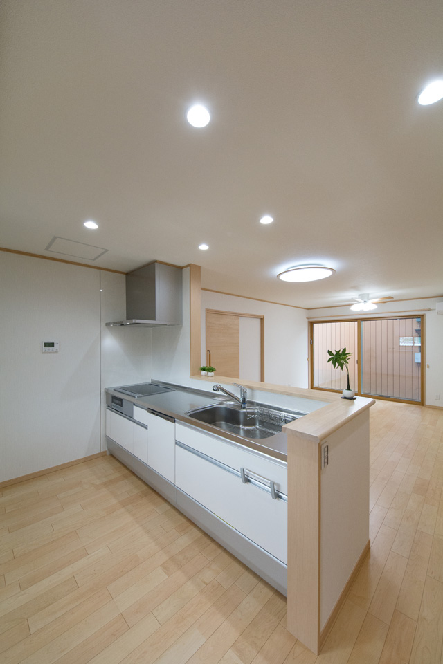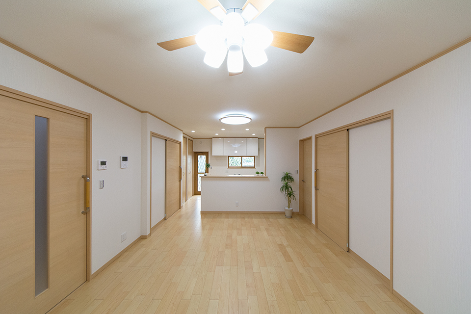 1階LDK―やわらかな木目が印象的なハードメープルのフローリング。ブラウンの建具と相まってナチュラルな雰囲気を演出します。