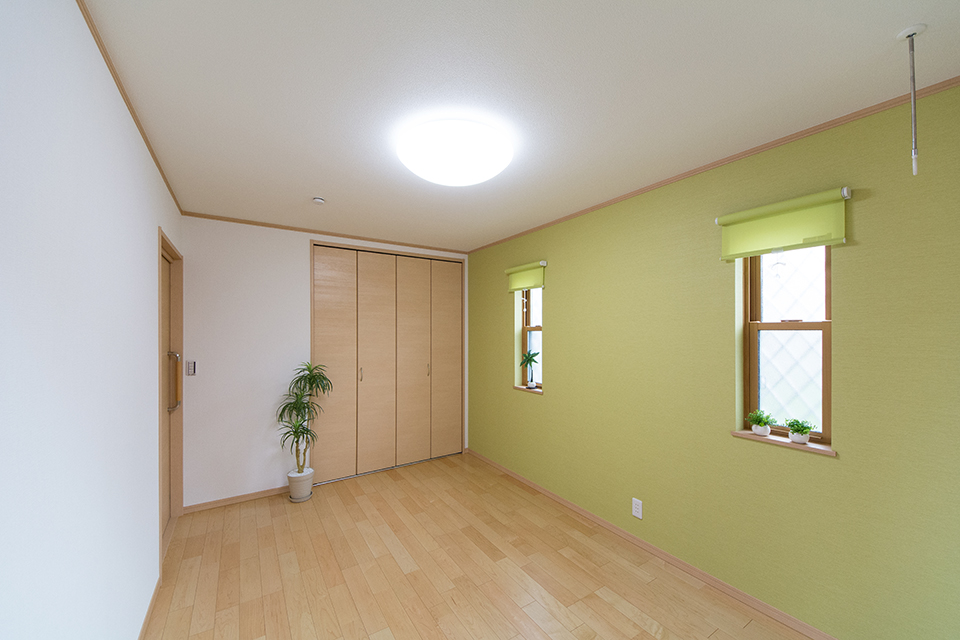 1階洋室―グリーンのアクセントクロスが爽やかな印象を与えます。