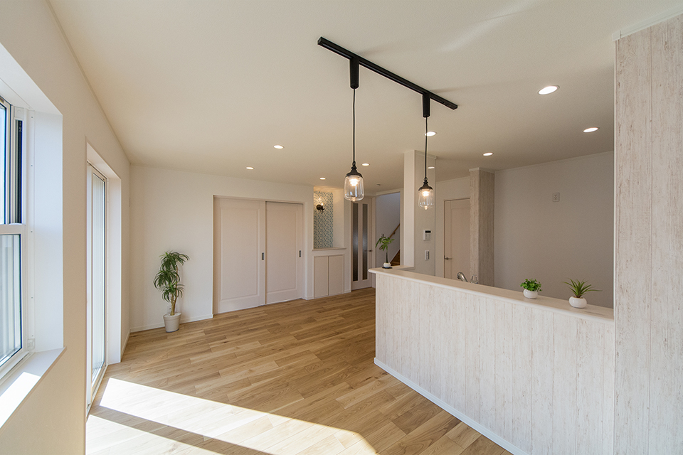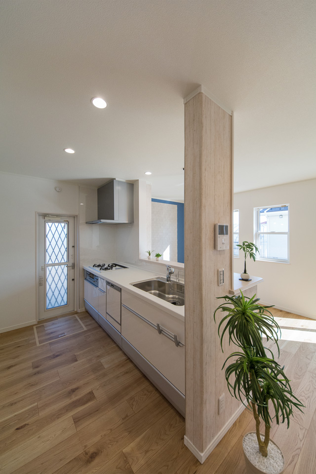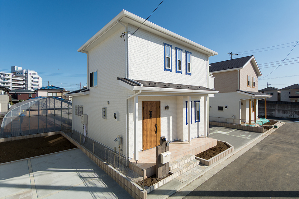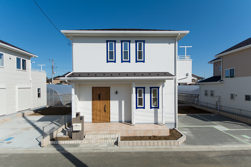 白のブリック調を全面にあしらった外観に、青色の窓モールが爽やかな印象をプラス。 青空に映えるノルディックモダンなデザインに仕上がりました。