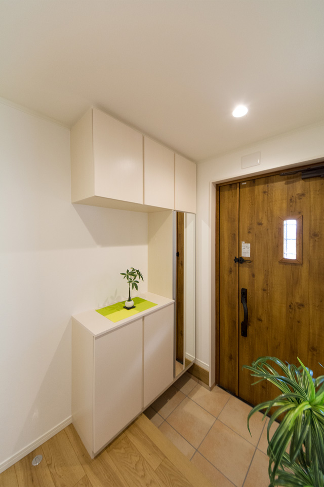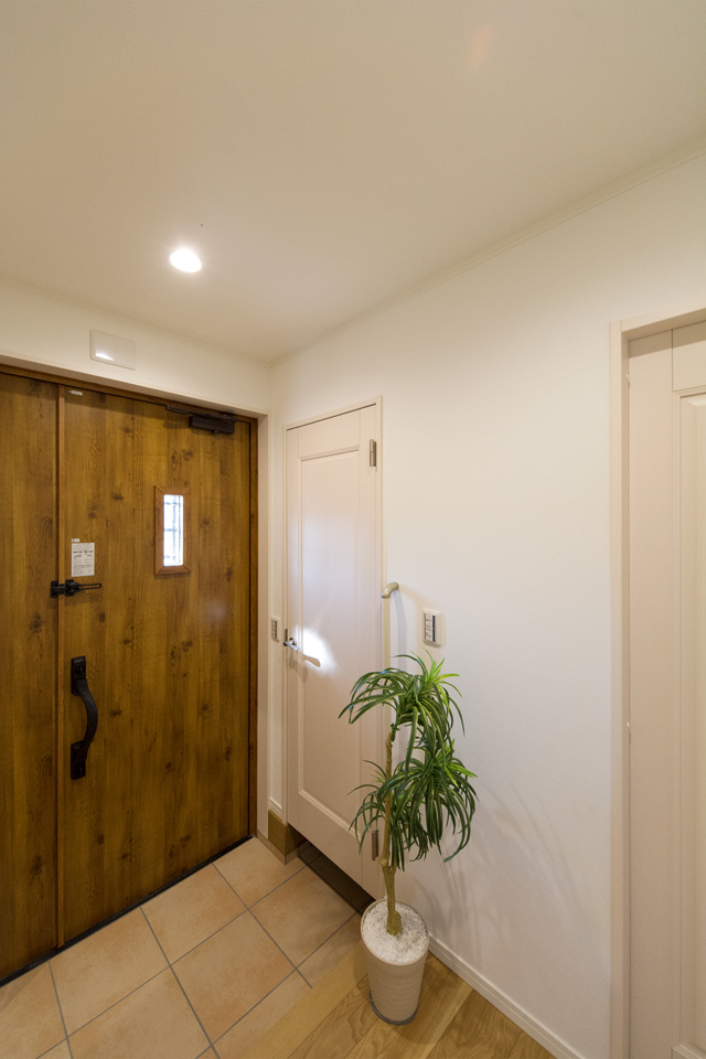 玄関ドアのガラス部分から差し込む光が、明るく開放的ある空間を演出。マキアートパインの玄関ドアがナチュラルな雰囲気を与えます。