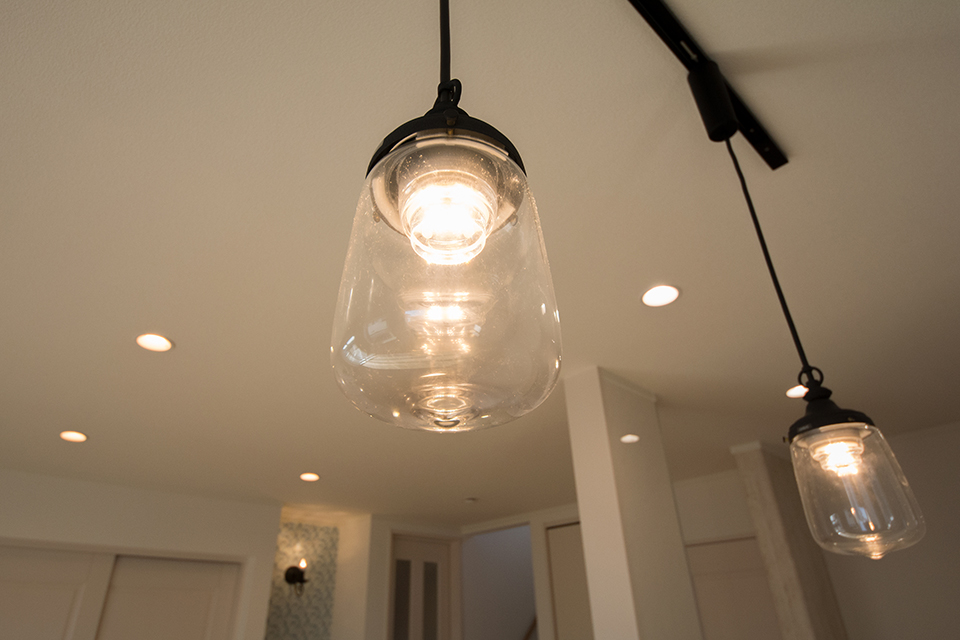 ガラスシェードのペンダントライトがダイニング空間を彩ります。