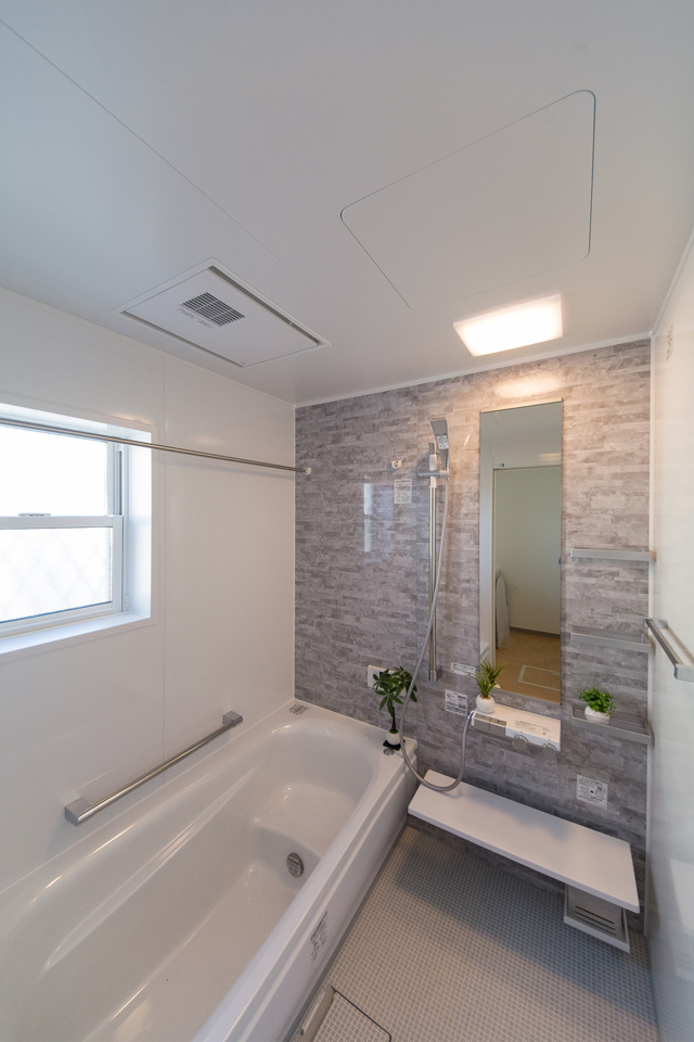 爽やかな色合いのアクセントパネルが印象的なバスルーム。