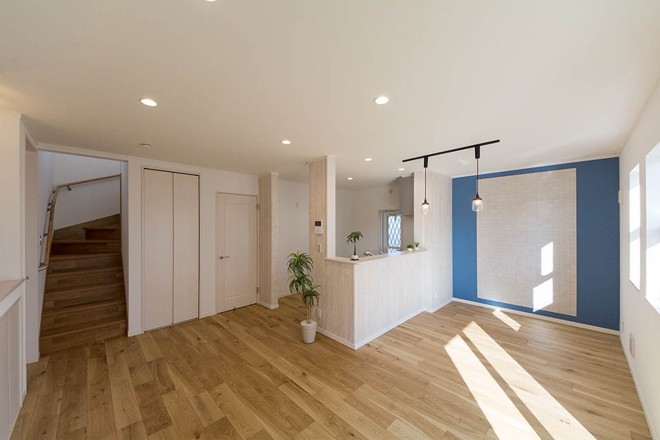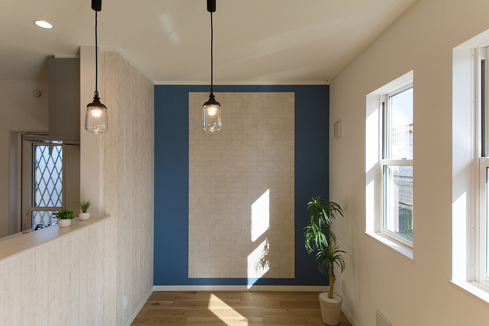 空気を美しく整えるインテリア壁材「エコカラット」とブルーのアクセントクロスをあしらった壁面が、リビング空間を爽やかに彩ります。